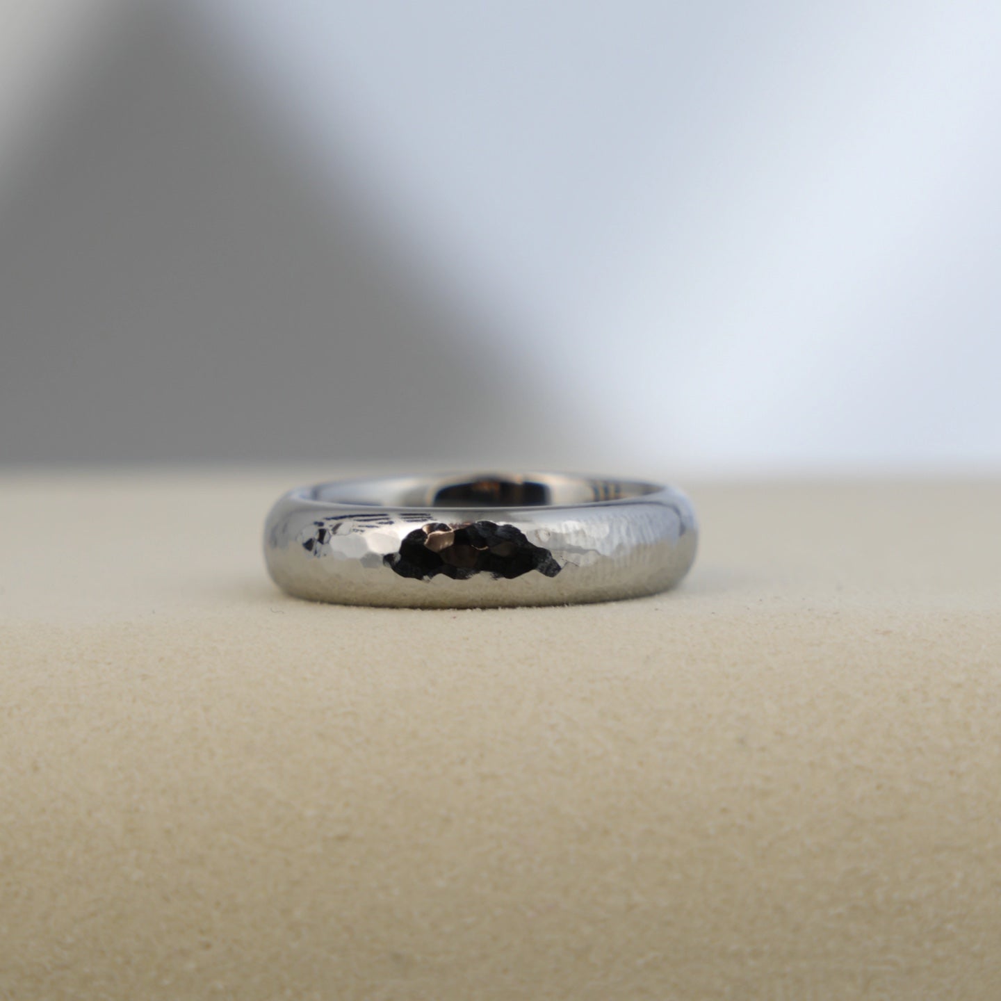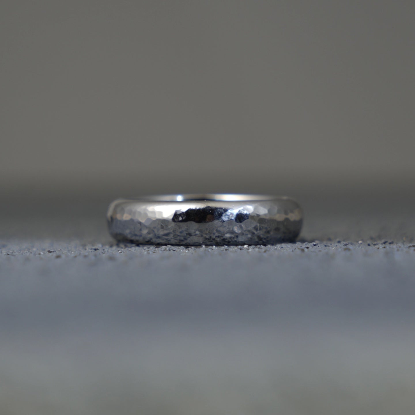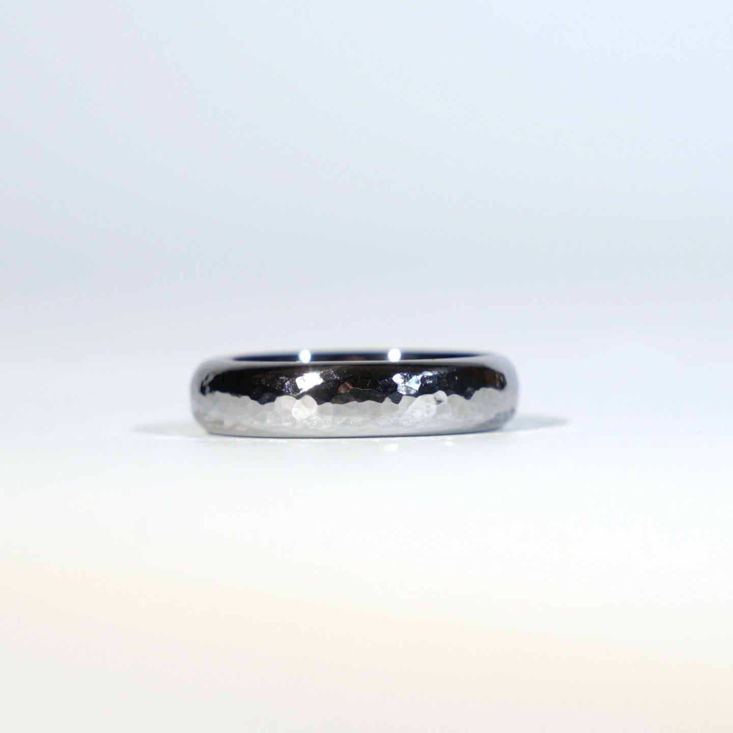 - The Art of the Hammered Finish Rhenium's immense hardness and extreme melting point make it notoriously difficult to work. Our founder has dedicated 20 years to this single element. Instead of a simple polish, we chose a hand-hammered finish. Each hammer strike is a deliberate act, imprinting a unique pattern of facets onto the metal's surface. This textured finish not only tells the story of its creation but also catches and plays with light in a way no polished surface can. Each ring is, therefore, one of a kind.